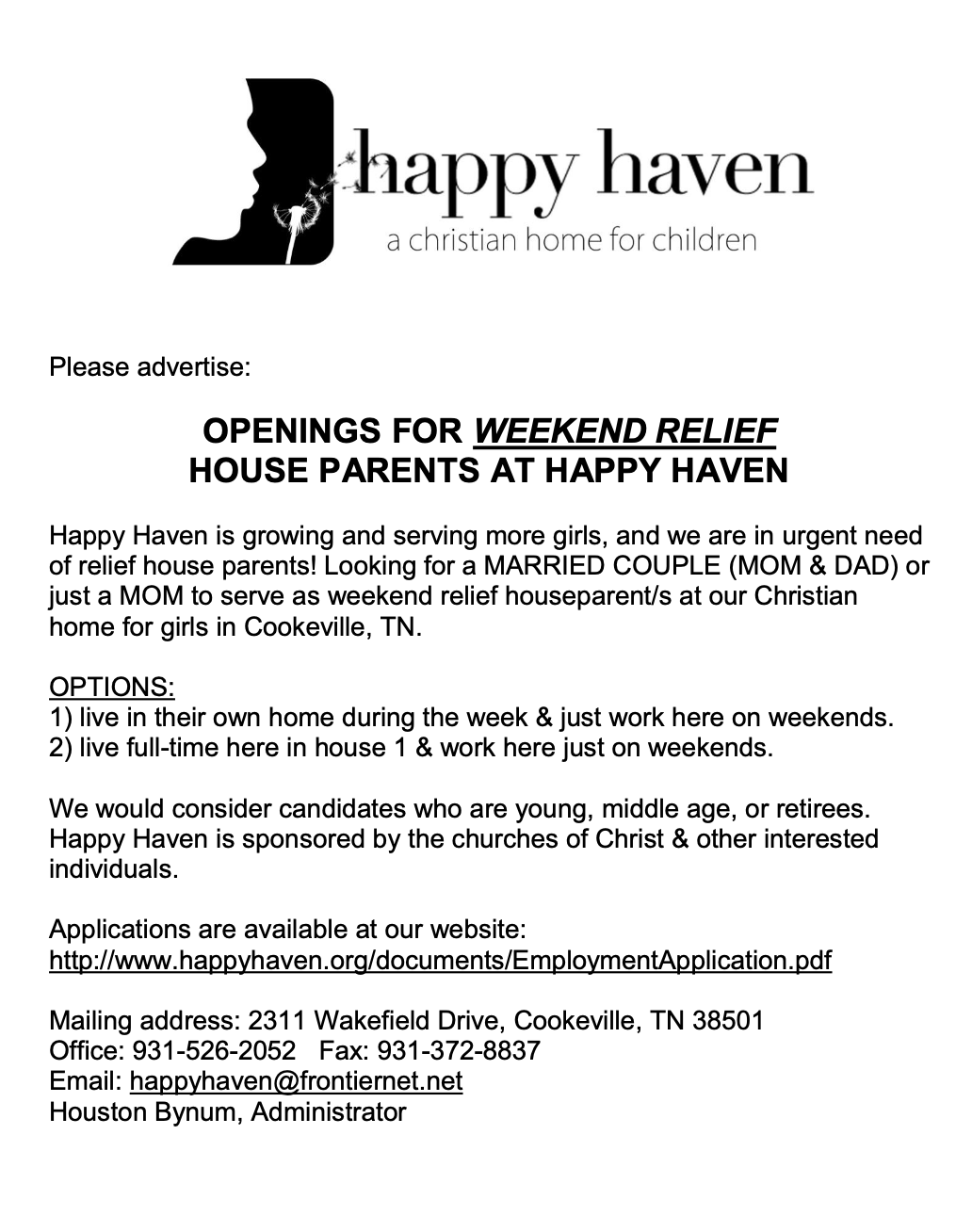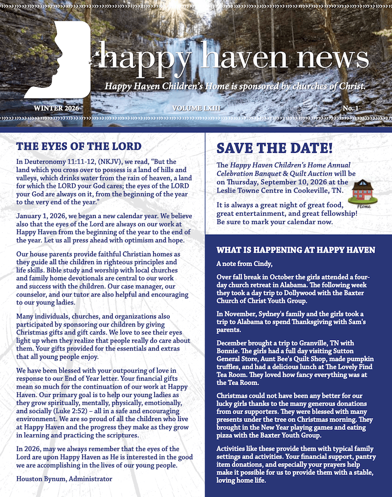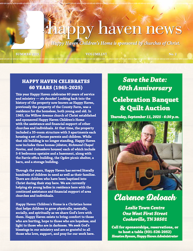 Happy Haven Homes, Inc., is licensed by the state of Tennessee as a residential child care agency and is a 501(c)(3) organization. Happy Haven does not receive state funding. This Christian group home is sponsored and supported by churches of Christ, other individuals and businesses. Happy Haven provides a safe, supportive environment for children in need (ages 5-17).